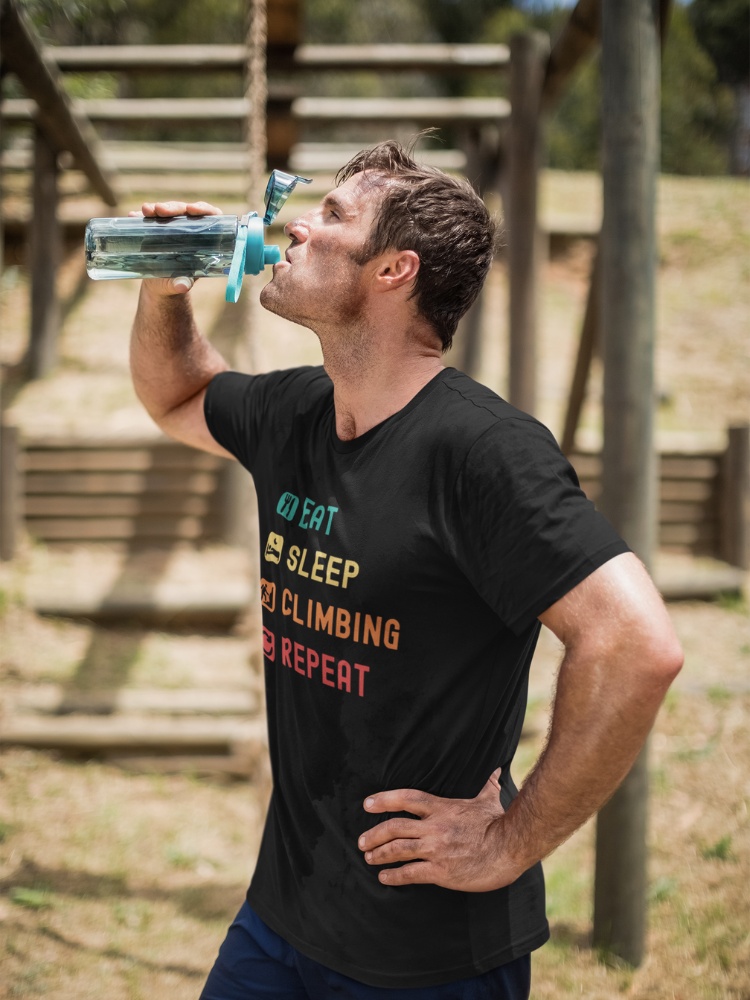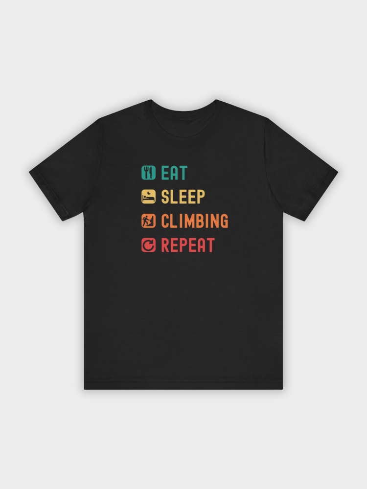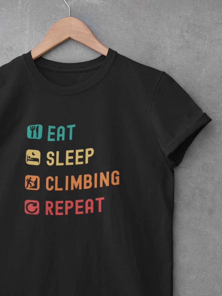 Het Eat Sleep Climbing Repeat T-shirt is voor wie leeft in het ritme van de wand.